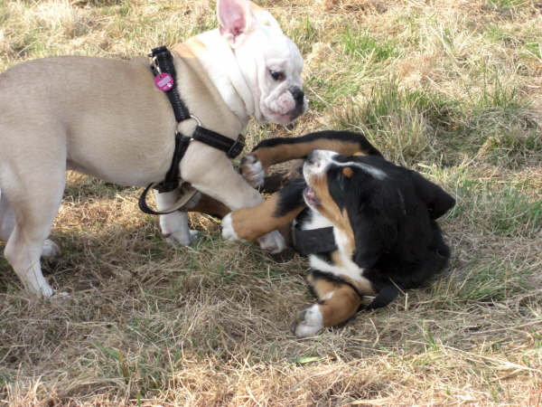 Die Hunde lernen durch das Spielen mit gleichaltrigen Hunden Grundlagen für ein sozialverträgliches Miteinander.
